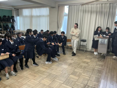 授業では、ホームルーム班が松山市での国際化への取り組みや聞き取り調査の結果を発表しました。その後、本校のALTであるジョシュア先生をお招きし、聞き取り調査で浮かび上がった課題について、ジョシュア先生も交えてディスカッションを行いました。